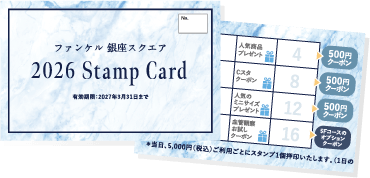 ファンケル 銀座スクエアを“楽しく、お得に”ご利用いただける、 「スタンプカード」をご用意。 5,000円ご利用ごとに1スタンププレゼント。 スタンプを集めるごとに銀座スクエア限定特典をプレゼントいたします!