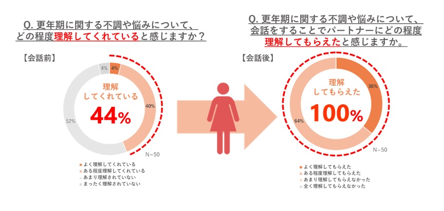 しかし、更年期について会話をした後は、女性の100%が「理解してもらえた」、男性の96%が「理解できた」と回答。会話前には「理解されていない」「理解していない」と答える人が多数を占めていましたが、会話を通して理解度が大きく改善することが示されました。