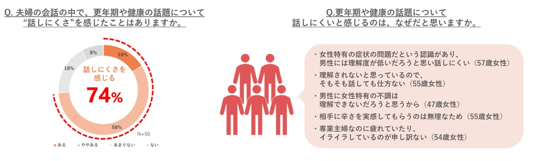 「体調や健康のこと」をよく話すと女性全員が回答している一方で、「更年期や健康の話題について“話しにくさ”を感じたことはあるか」と聞いたところ、「ある/ときどきある」と回答した女性は74%にのぼりました。つまり、日常的な健康や体調の話題は夫婦間で交わされているにもかかわらず、更年期となると一歩踏み込んで話しにくいと感じている様子がうかがえます。理由としては、「女性特有の症状の問題だという認識があり、男性には理解度が低いだろうと思い、話しにくい。」「理解されないと思っているので、そもそも話しても仕方ないと感じている。」といった“理解されない”と思っている意見が多く見られました。