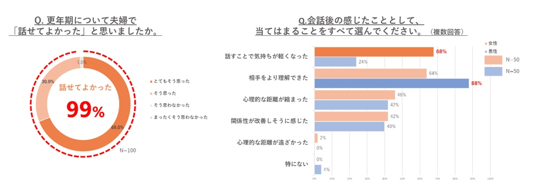 更年期について夫婦で会話を行った後、「夫婦で話せてよかったと思うか」という質問に対して、全体の99%が「話せてよかった」と回答しました。多くの夫婦にとって、これまで深く話すことのなかった話題に向き合い会話することが、大きな安心感につながったことが分かります。具体的には、「会話後に感じたこと」として、女性の68%が「気持ちが軽くなった」、64%が「相手をより理解できた」と回答し、会話によって心理的な負担が和らぎ、関係性も前向きに変化していることが明らかになりました。男性も「相手をより理解できた」88%、「心理的な距離が縮まった」42%と、会話することによって妻をより身近に感じるといった変化が読み取れます。