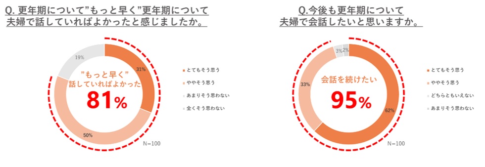 さらに、「もっと早く更年期について夫婦で話していればよかった」と感じた人は全体の81%にのぼり、95%が「今後も更年期について会話を続けたい」と回答しました。この結果から、会話は更年期に関する理解を深めるだけでなく、安心感を得て前向きな関係を築くための重要なきっかけになることが示されました。