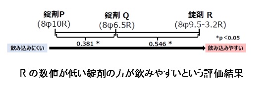 一般的な錠剤は上下がなだらかな曲面になっています。今回、この曲面の丸みの度合い(=曲率半径、以下Rと表記)を変えることで、飲みやすさがどう変わるかを評価しました。同じ重さの錠剤でも、Rを小さくすると見た目はより丸く、球体に近くなり、厚みはやや増えます。それでも、Rが小さい、いわゆるより丸みが強い錠剤の方が、総合的に「飲みやすい」という結果が得られました (下図)。