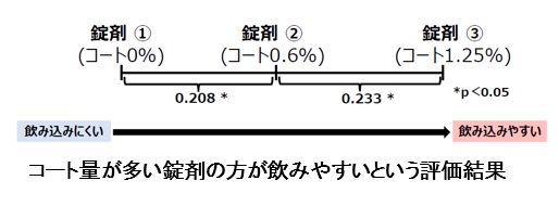 錠剤の表面にコーティング膜を設けることで錠剤の苦みを軽減することは、一般的に用いられる手法として知られています。本研究では、このコーティング膜の厚さによって飲みやすさが変化するかどうかを確認しました。コーティング剤の錠剤重量に占める割合を0%から1.25%まで変化させて評価した結果、コーティング量が増えるほど飲みやすさが高ま ることを明らかにしました(下図)。