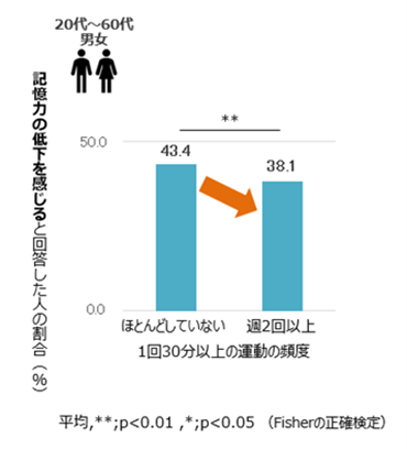 - 「週2回以上」の運動習慣がある人は、「ほとんどしていない」と回答した人と比較して、「記憶力の低下を感じる」割合が低かった。