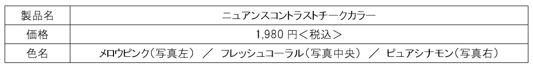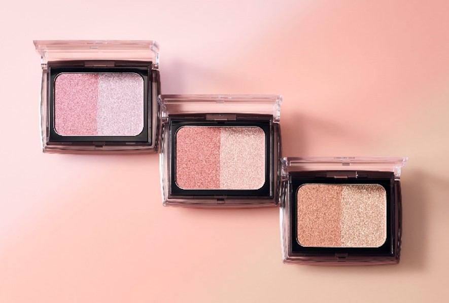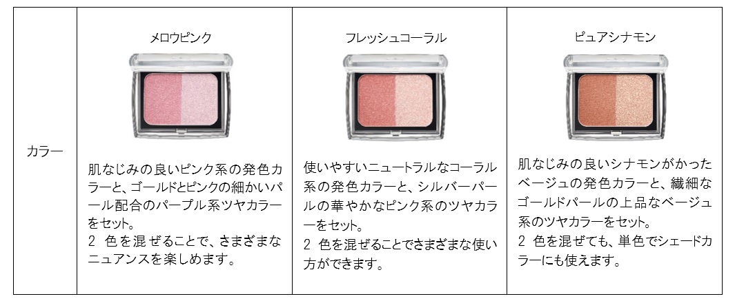 発色の良いカラーとツヤのあるカラーの2色をセットし、ひと塗りで簡単に立体感のある健康的な明るい幸せ顔を作るチークカラーです。乾燥しやすい頬をケアする美容液成分(保湿成分)の配合や、メイクヨレを防ぎながら発色を維持するWメイク持ち処方を採用しました。