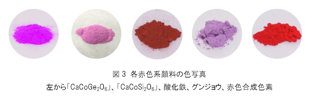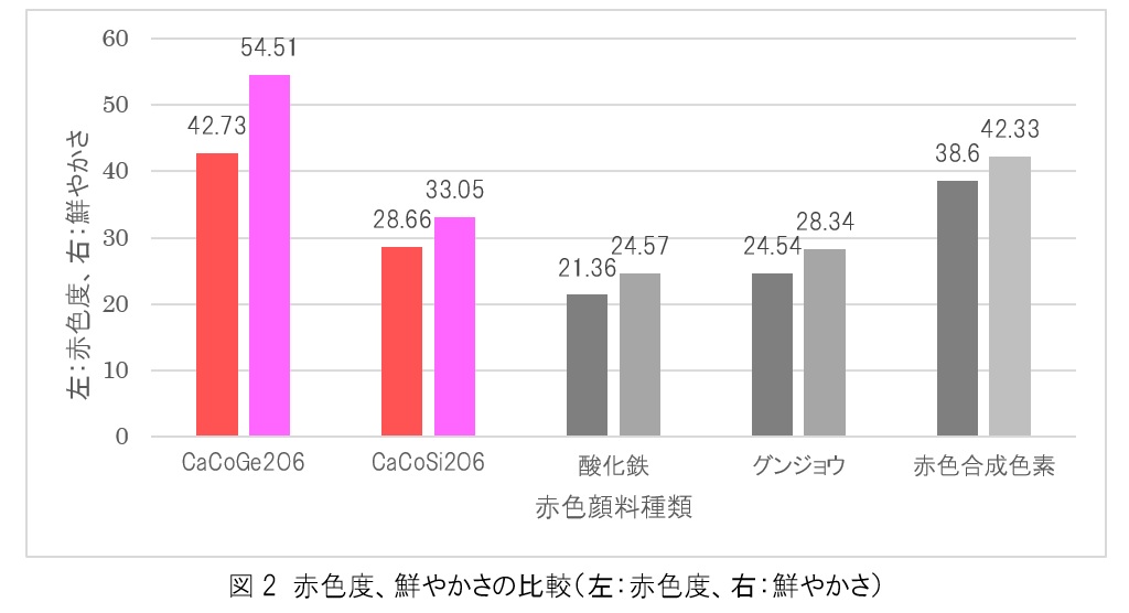 測定および算出した結果、開発した「CaCoGe2O6」と「CaCoSi2O6」は、既存の赤色系無機顔料である酸化鉄、グンジョウを超える鮮やかさと高い赤色度を兼ね備えていることを確認しました(表1、図2、図3)。