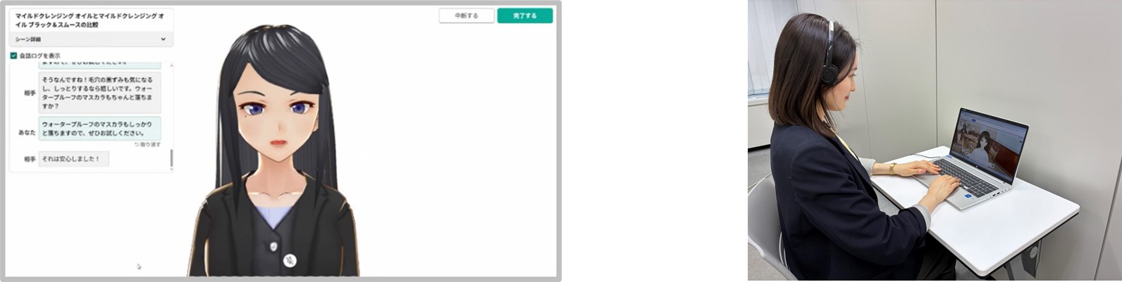 - 概要:人工知能を活用し、お客様とのロールプレイングを通じて、接客・応対スキルを実践的に学ぶ取り組みです。時間や場所にとらわれず繰り返し練習できる環境を整えるとともに、事前に設定した評価基準に基づくフィードバックにより、応対品質のばらつきを抑え、安定した育成を実現します。ファンケルが大切にしてきた価値観を反映した研修を通じて、「人に寄り添う応対」を次世代へと継承していきます。
