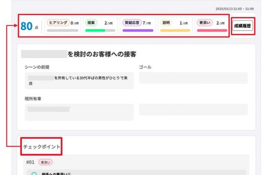 事前に設定した評価基準に基づき、応対内容を客観的に可視化することで、評価のばらつきを抑え、安定した育成を実現します。会話内容を振り返ることができるため、受講者自身が改善点を認識し、次の応対に生かすことが可能です。