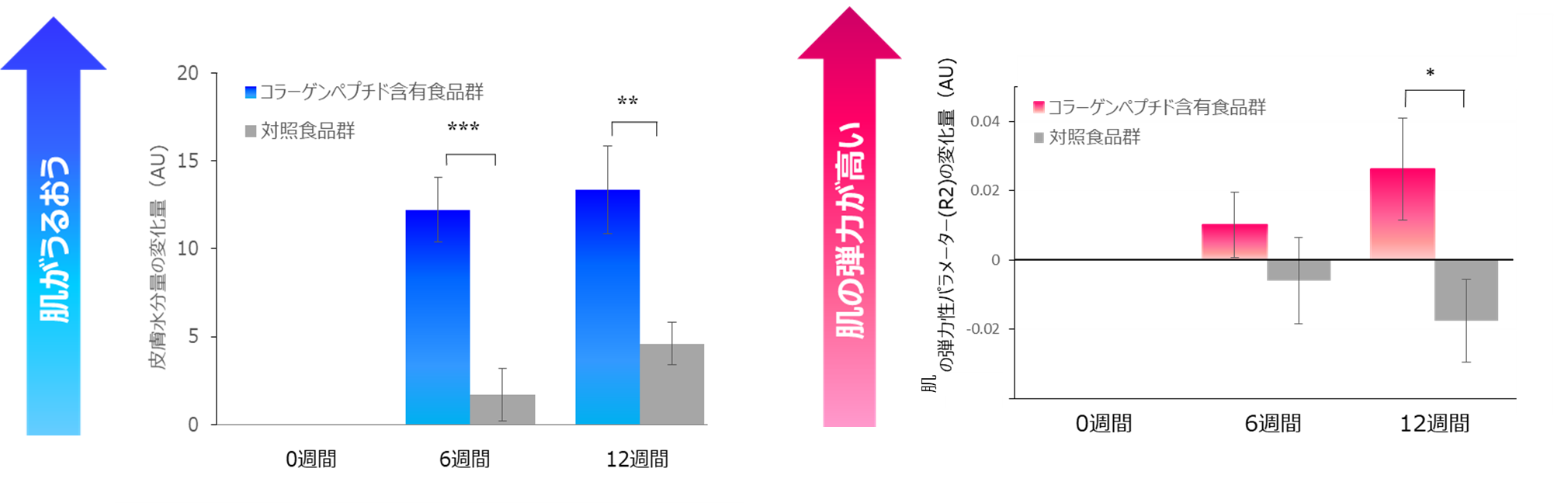 同製品に配合されている機能性関与成分「コラーゲンペプチド」はメカニズムとして、コラーゲンやエラスチンの過度な分解を抑えるとともに、コラーゲンやヒアルロン酸の合成を促すと考えられており、その結果肌のうるおいと弾力を維持し、肌の健康に役立つと考えられています。実際に、コラーゲンペプチドを1日1,000mg摂取群と、コラーゲンペプチド0mg摂取群を比較した試験において、肌のうるおいが6週間、肌の弾力は12週間で、有意差があると報告されています。