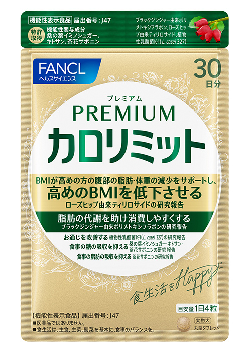 - 製品特長 : 食事の糖や脂肪の吸収を抑えて食後の血糖値と血中中性脂肪値の上昇を抑えるカロリミットの従来機能に加え、脂肪の代謝を助けて消費しやすくし、BMIが高めの方の腹部脂肪を減らす機能が報告されている「ブラックジンジャー由来ポリメトキシフラボン」を配合。年齢のせいと諦めがちな代謝低下に悩む大人をサポートします。